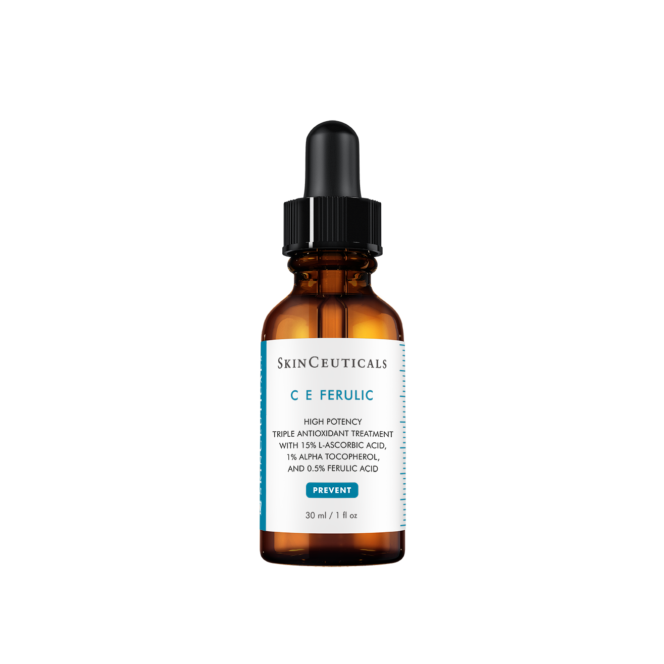 SkinCeuticals C E Ferulic is a high potency serum with a combination of powerful antioxidants to protect skin against atmospheric ageing. 15% pure vitamin C (L-ascorbic acid), 1% vitamin E (alpha tocopherol), and 0.5% ferulic acid work in combination to protect against environmental damage and premature signs of ageing caused by free radical damage from UV rays, infrared radiation (IRA), and ozone pollution (O3).