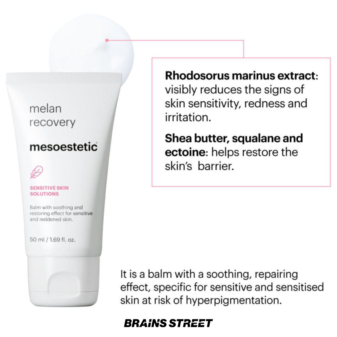 Mesoestetic Melan Recovery is a soothing recovery balm that calms redness, restores comfort, and strengthens the skin’s barrier after aesthetic treatments or daily external aggressions.