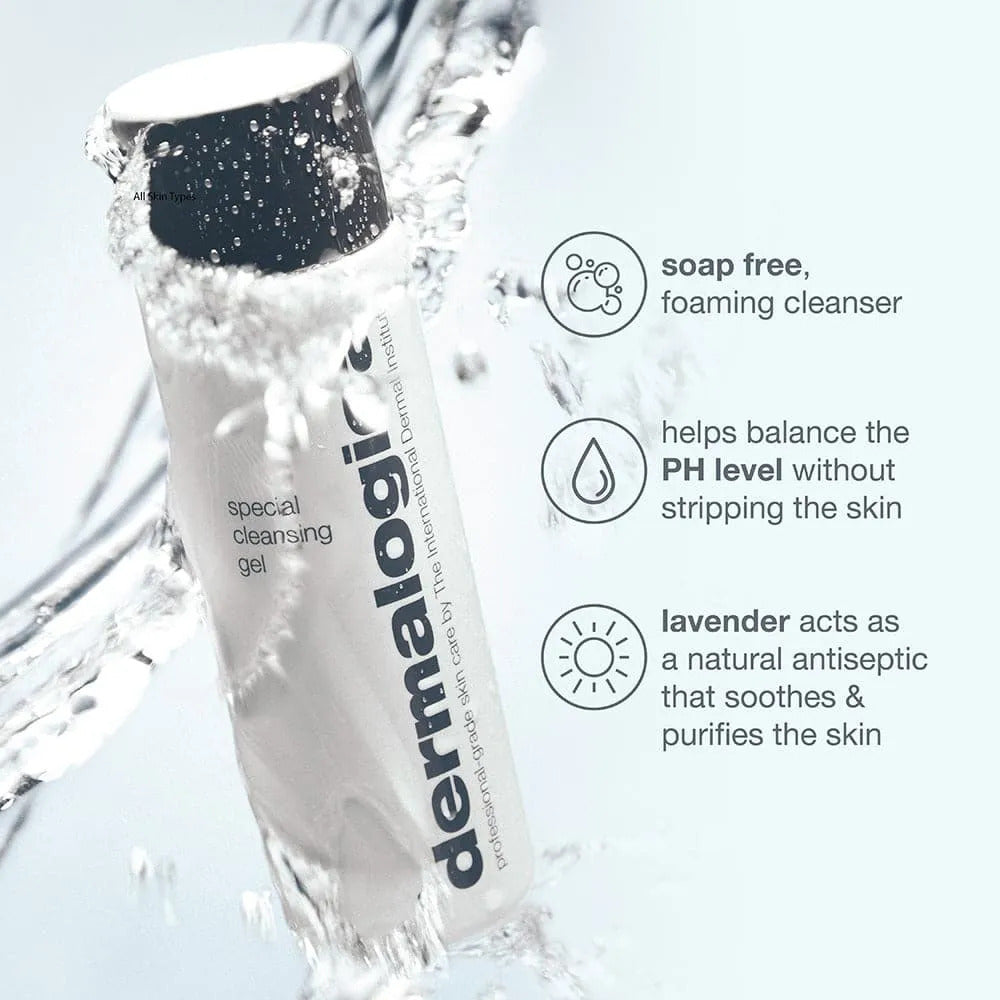 Dermalogica Special Cleansing Gel is a soap-free, foaming gel designed to thoroughly remove impurities without disturbing the skin's natural moisture balance. Anti-inflammatory balm mint extract soothes inflammation while natural Quillaia Saponaria gently foams away toxins and deep cleans debris. Astringent lavender extract minimises the appearance of pores and balances pH levels.