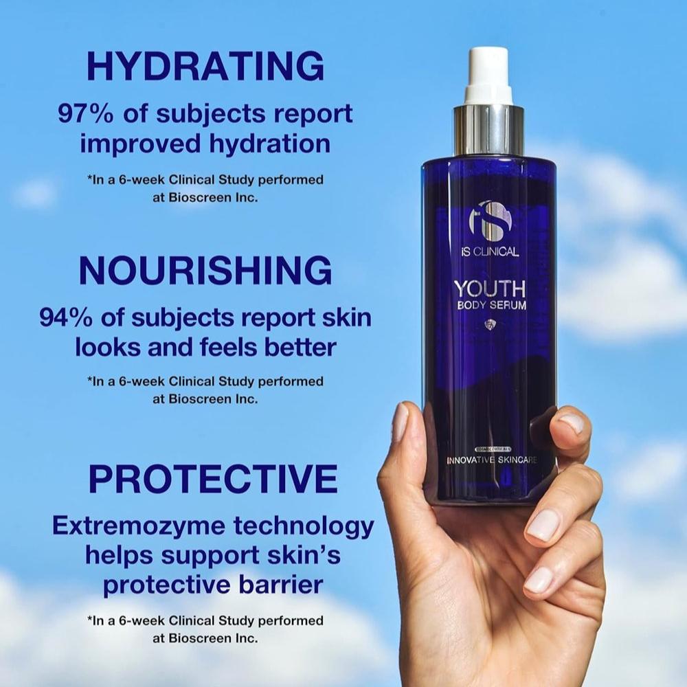 Reveal your most youthful, radiant skin with iS Clinical Youth Body Serum. Much more than a moisturiser, this nourishing treatment leaves skin feeling fresh, soft, and more hydrated. Suitable for all skin types and perfect for post-sun exposure.